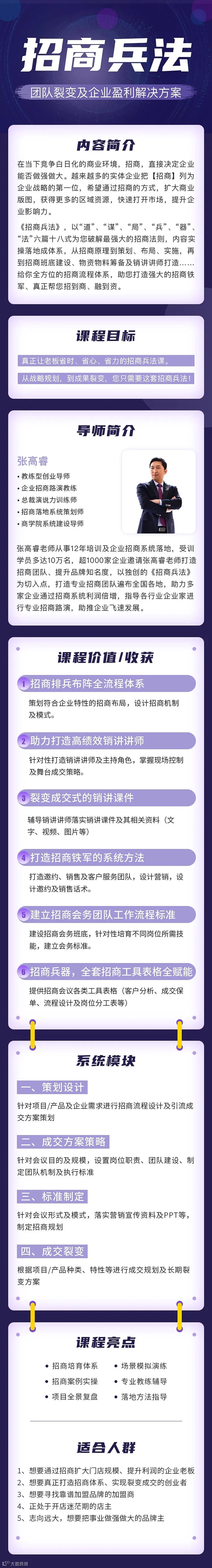 由企业招商路演教练、招商落地系统策划师张高睿老师匠心打造的《招商兵法》实战课程,将从招商内在原理,到策划、布局、实施,再到招商班底建设、物资物料筹备及销讲讲师打造,通过各个维度帮助企业家学员快速拥有专业的招商体系及招商班底。