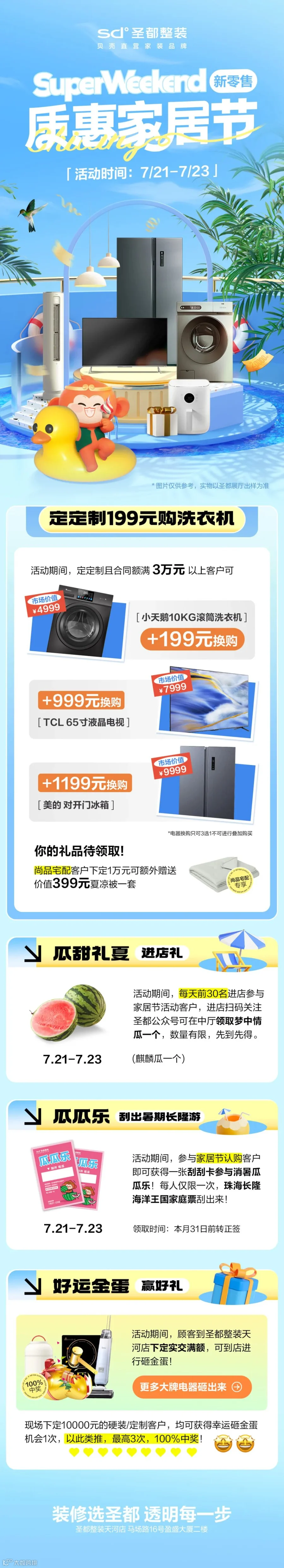 如何让装修预算花得值?快来圣都整装第⼆期质惠家居节吧!7月21日-23日质惠家居节将在圣都整装·天河店开启,进店不仅可以领甜蜜西瓜,199元购大牌洗衣机,参与活动还能刮出长隆海洋王国双人门票,超多好礼等你来解锁!