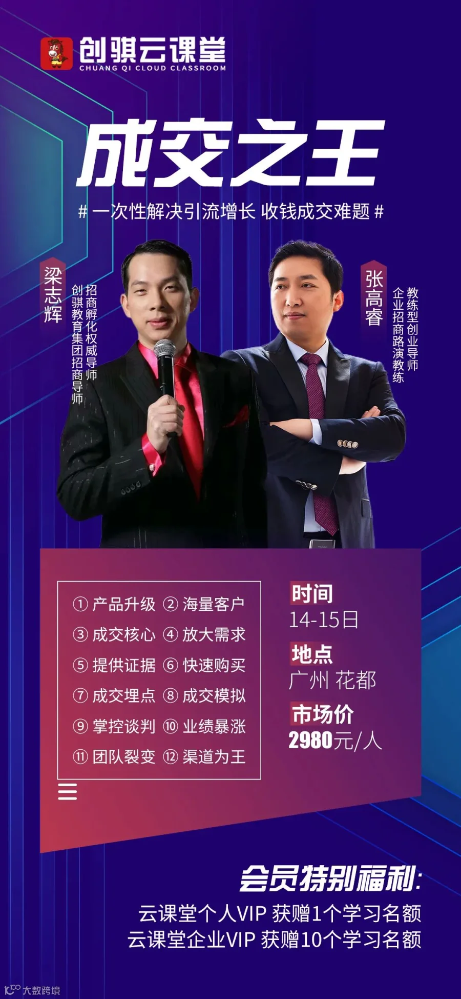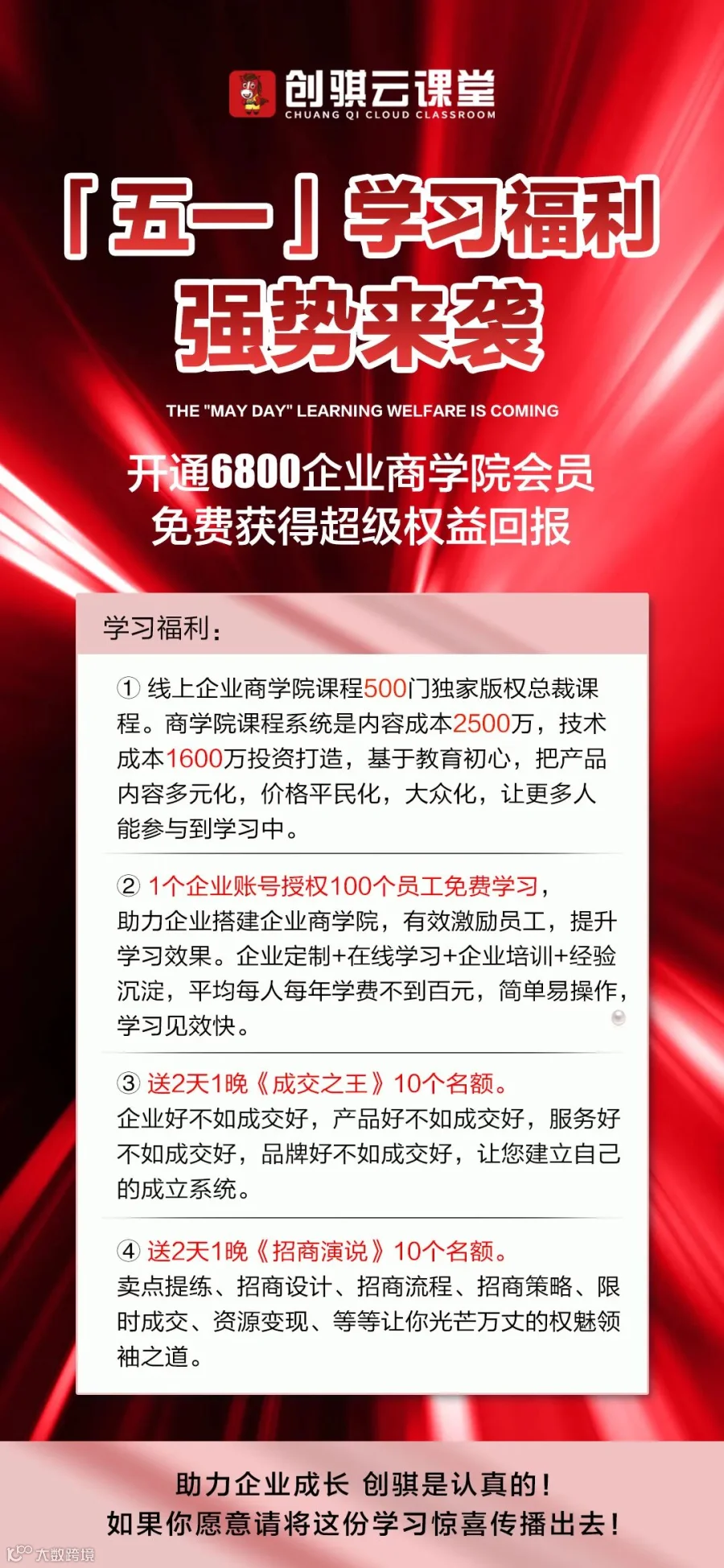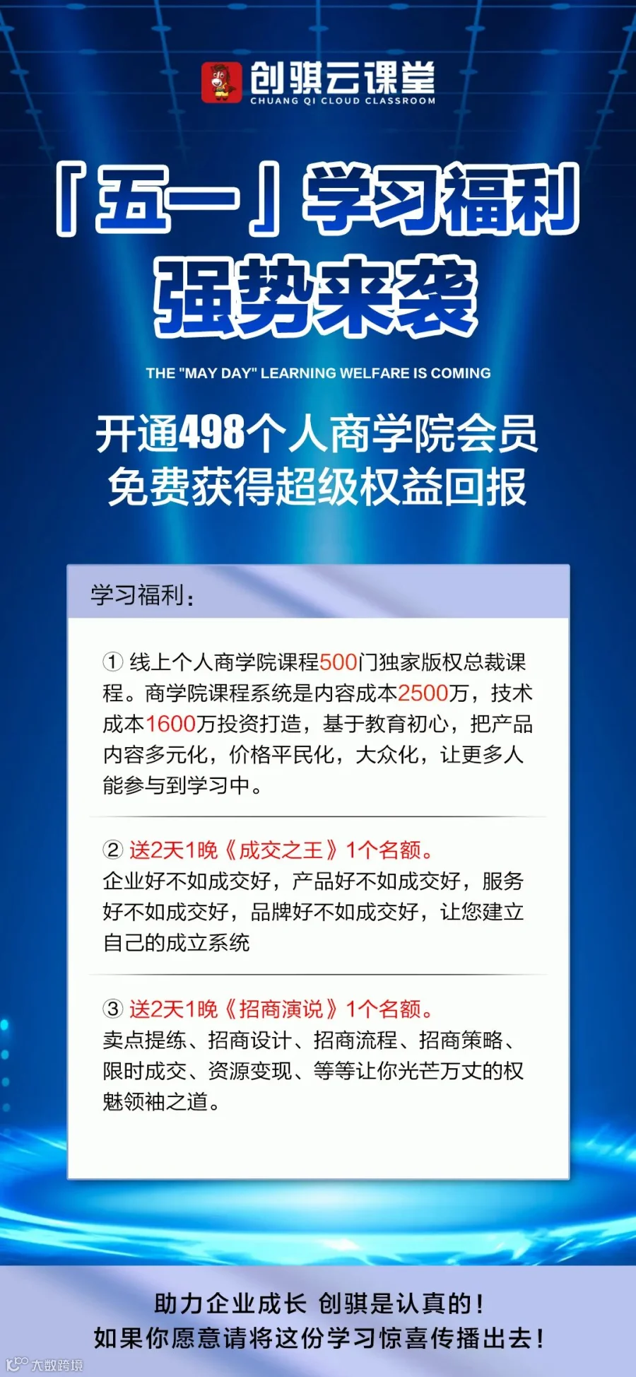 这两门课程可谓是我们创骐的爆品课,场场爆满,口碑如潮,只要你参加了一次还想再报名的那种,两门爆品课教你真正做一场人数爆棚、成交爆棚的招商会,让你掌握成交之王的业绩系统,成交系统,只要加入个人商学院,就能免费送学习名额!