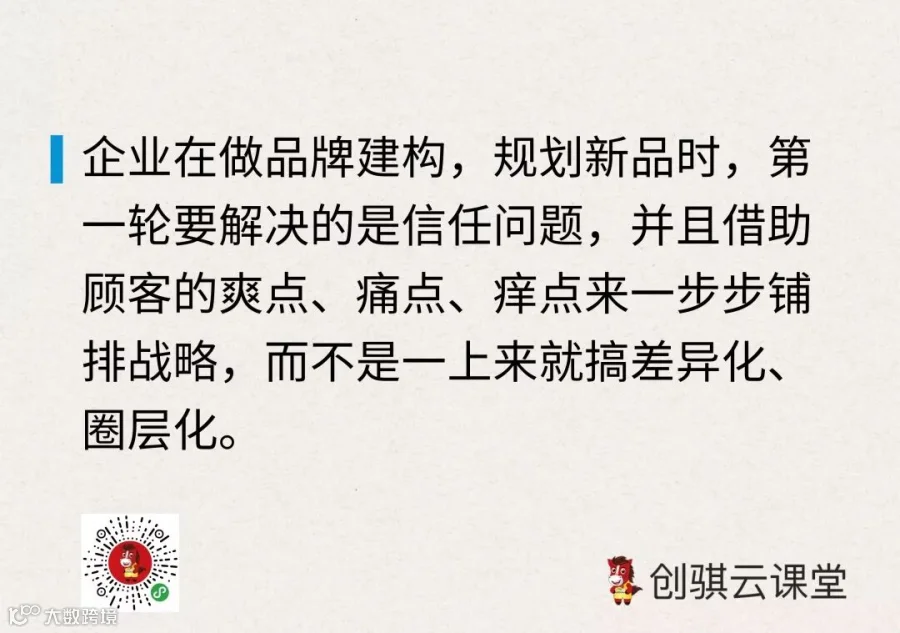 同样,企业在做品牌建构,规划新品时,第一轮要解决的是信任问题,并且借助顾客的爽点、痛点、痒点来一步步铺排战略,而不是一上来就搞差异化、圈层化。