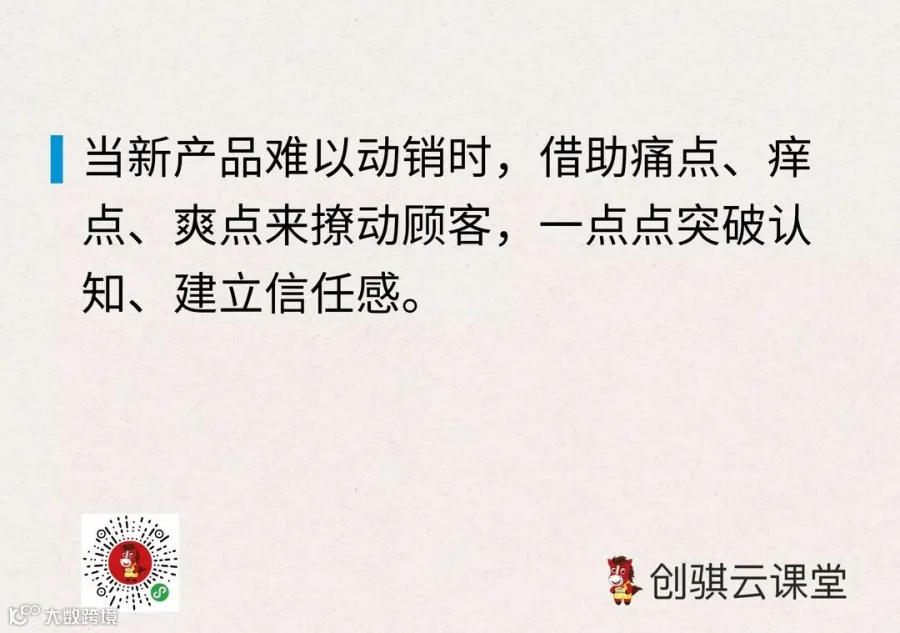 这时就要借助痛点、痒点、爽点来撩动顾客,一点点突破认知、建立信任感。关于痛点、痒点、爽点这三个词,梁宁老师是这样诠释的: