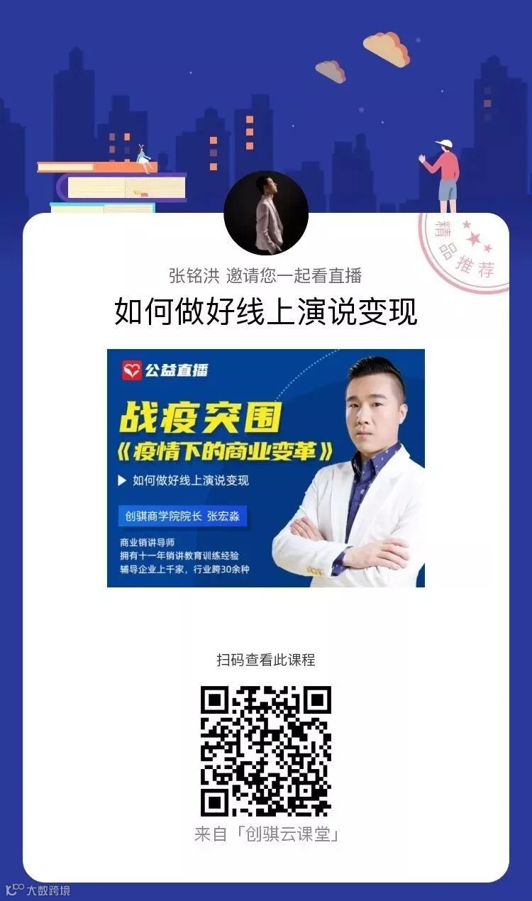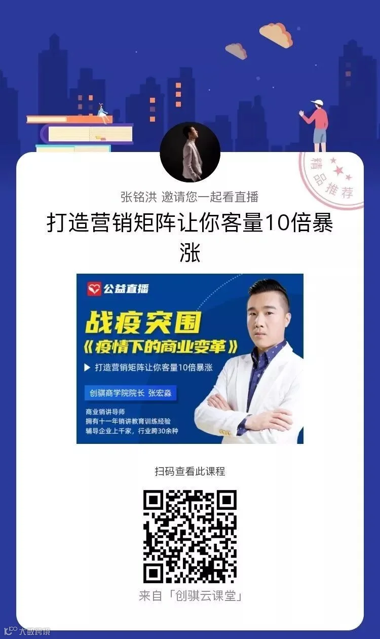 为了帮助更多企业早日实现互联网化转型升级,打造强势品牌营销矩阵,实现转化目标,创骐云课堂商学院长 张宏淼将给大家带来一场公益直播《疫情下的商业变革:打造营销矩阵让你客量10倍暴涨》,他将用1小时的直播,为大家深入解读并提供有效方案: