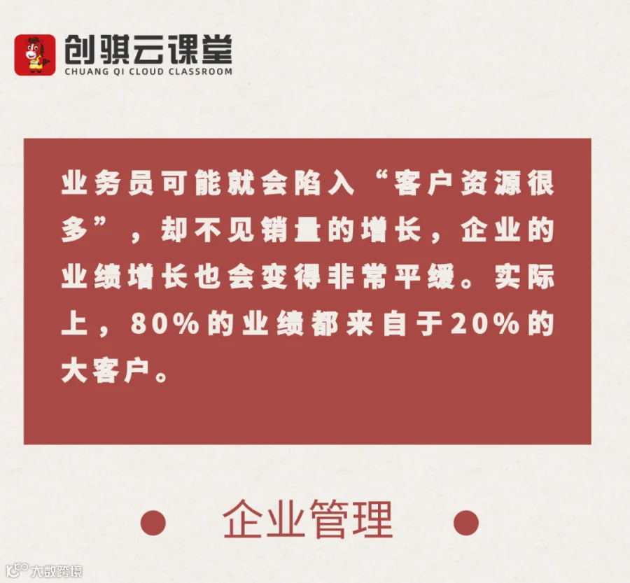 业绩销售冠军都懂得销售的二八定律,80%的销量和利润来自于20%的大客户,另外的20%的利润则来源于普通的客户。