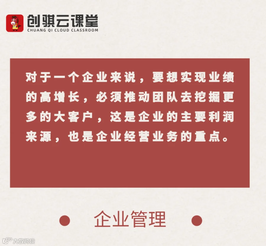 可见,对于一个企业来说,要想实现业绩的高增长,必须推动团队去挖掘更多的大客户,这是企业的主要利润来源,也是企业经营业务的重点。