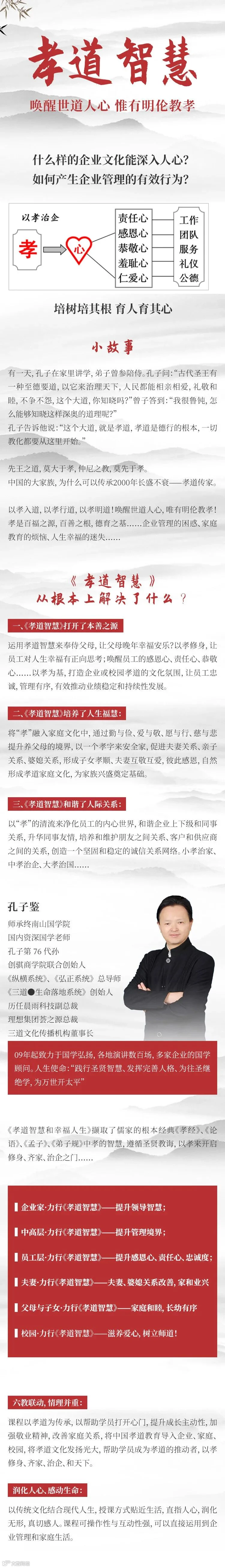 在课程中,孔子鉴老师将和大家分享,运用孝道智慧来奉侍父母,让父母晚年幸福安乐;以孝修身,让员工对人生幸福有正向思考;唤醒员工的感恩心、责任心、恭敬心……以孝为基,打造企业或校园孝道的文化氛围,让员工忠诚,管理有序,有效推动业绩稳定和持续性发展。