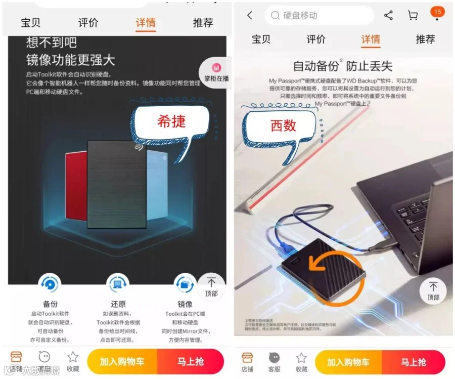 可以看到,三家品牌的移动硬盘都提到了“安全”的卖点,而其中希捷和西数两家品牌均对这个卖点做了延展: