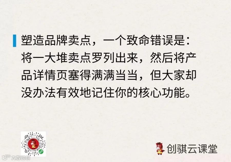在品牌卖点的塑造上,很多人往往犯的一个致命错误是:将一大堆卖点罗列出来,然后将产品详情页塞得满满当当,但是大家却没办法有效地记住你的核心功能,那么这时我们塑造的便是无效的卖点。