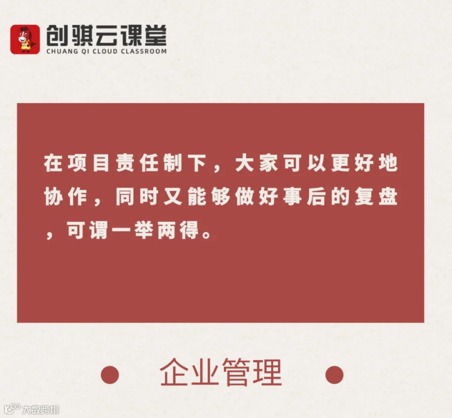 在项目责任制下,大家可以更好地协作,同时又能够做好事后的复盘,可谓一举两得。