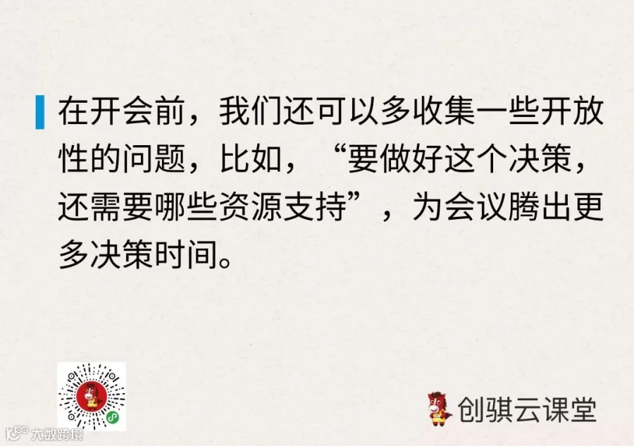 这可以起到一个预先提醒的效果,激发团队人员的创新性思考,给会议腾出更多的决策时间。