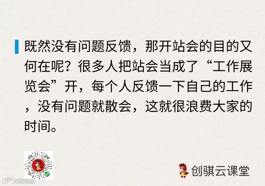 既然没有问题反馈,那开站会的目的又何在呢?很多人把站会当成了“工作展览会”开,每个人反馈一下自己的工作,没有问题就散会,这就很浪费大家的时间,另外,如果别人的工作反馈,和自己的工作完全不沾边的话,成员也容易走神,开小差。