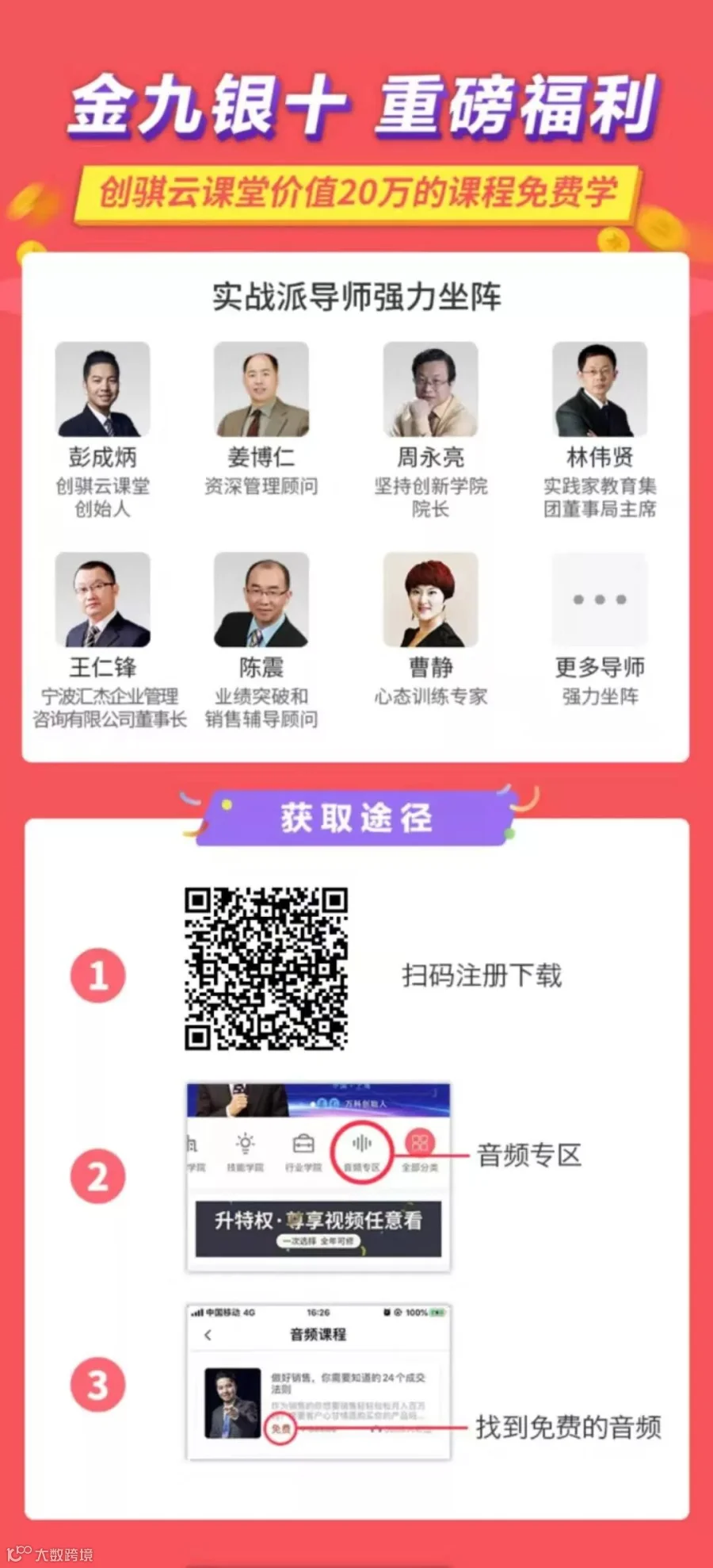 24个实战场景+销售成交秘诀拆解,课程内容统统可以免费学!如果你想成为月入过万的销售、策划、广告达人;轻松拿下人生第一个100万的业绩冠军;让公司业绩倍增暴涨的中小企业老板,那么强烈建议你听一听,保证让你一学就会,一听就懂。