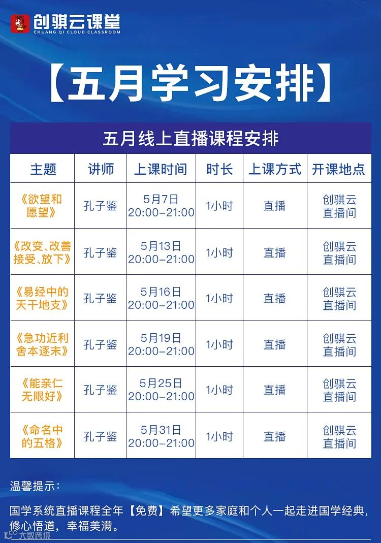 进入到美好的5月国学直播月,资深国学大师孔子鉴老师又会在创骐国学直播课堂跟大家见面啦!