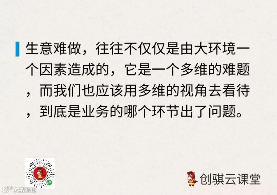 通过以上案例的分析,我想告诉大家的是,生意难做,往往不仅仅是由大环境一个因素造成的,它是一个多维的难题,而我们也应该用多维的视角去看待,更多地要从内部反思,到底是业务的哪个环节出了问题,而不仅局限于一种视角。