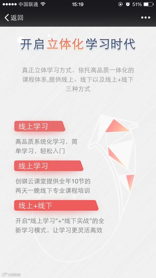 创骐云课堂主要是做企业管理培训,是一个线上实用的职场能力在线学习平台,宗旨是,为每一位想真真正正学到些实用知识、技能的学习者,提供贴心的一站式学习服务。
