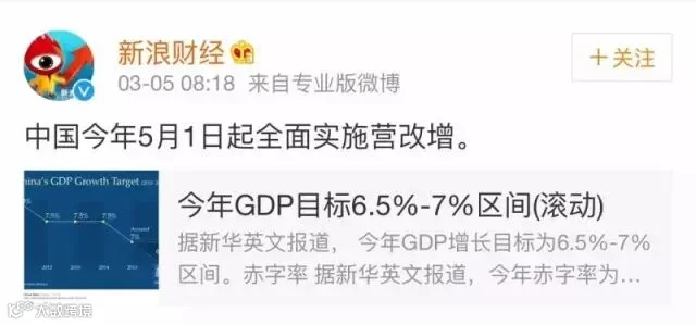 李克强指出,适度扩大财政赤字,主要用于减税降费,进一步减轻企业负担。今年将采取三项举措。一是全面实施营改增,从5月1日起,将试点范围扩大到建筑业、房地产业、金融业、生活服务业,并将所有企业新增不动产所含增值税纳入抵扣范围,确保所有行业税负只减不增。