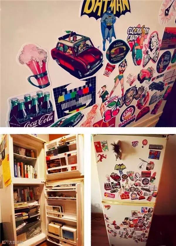 我把旧冰箱擦得干干净净,买了些贴纸贴上,放了柚子皮去除味道。我终于有了一个书柜。