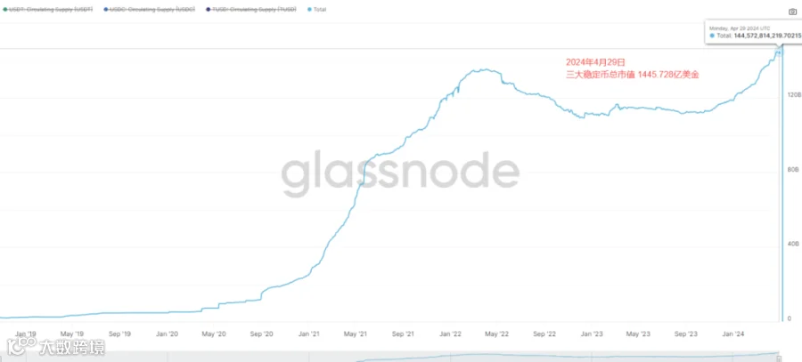 三大稳定币总市值1445.728亿美金,较之前1418.35亿美元,总市值再次增加约27.378亿美金。稳定币市值增速明显下降。