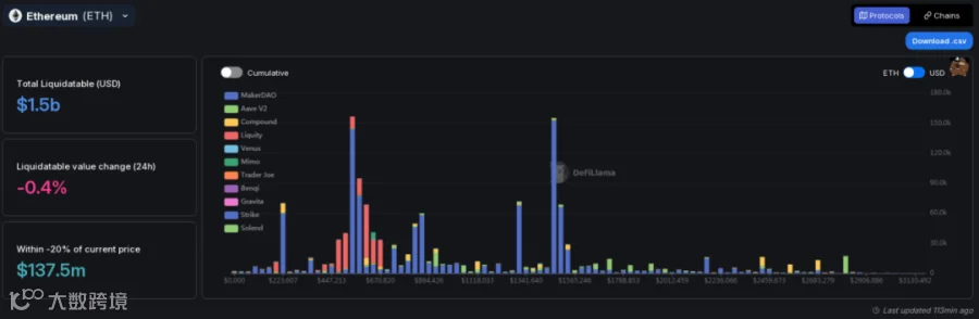 ii. 去中心化交易所方面,ETH1469开始有大额清算,在894至447为密集清算区,543为最大清算点。