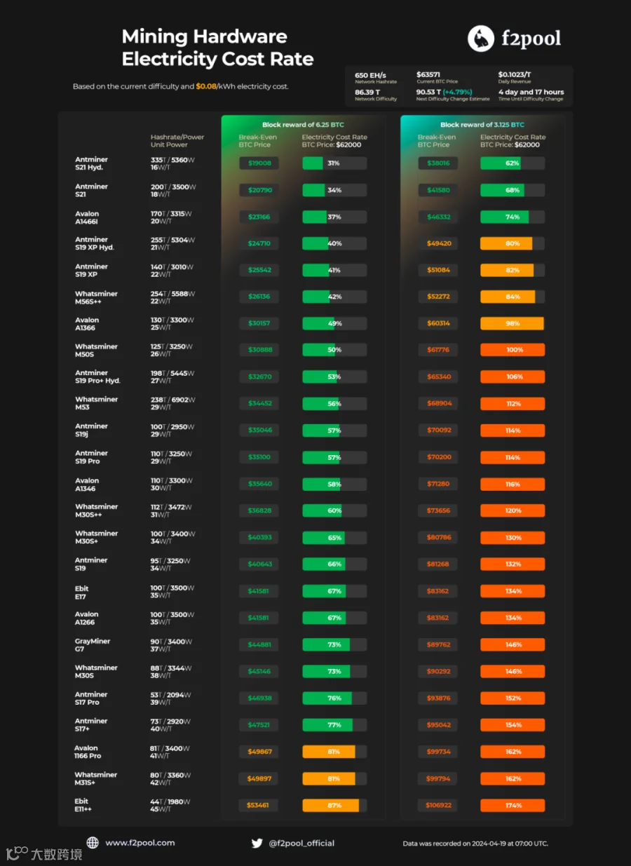 从矿机产币收益看,BTC减半之后大部分矿机只算挖矿产出已不足以支付电费。