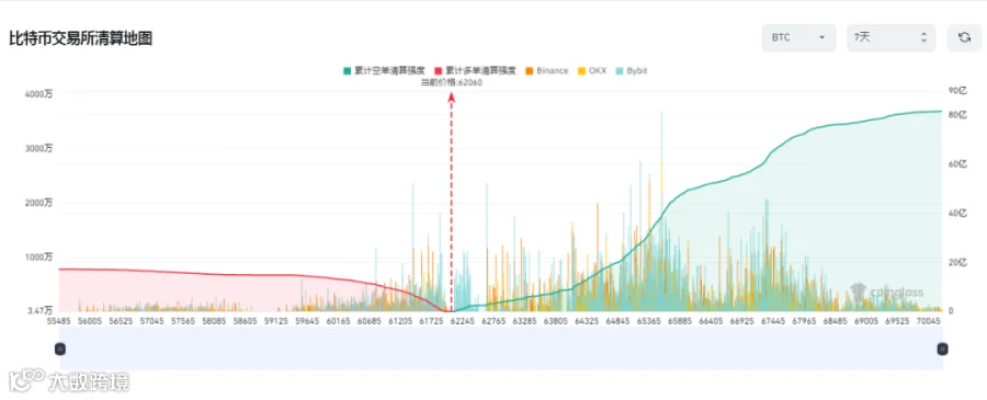 i. 从本周中心化交易所合约交易BTC清算地图来看,BTC本周空单累计清算强度远超于多单累计清算强度,多单累计清算强度17.18亿美元,空单方面累计清算强度81.37亿美元,空单在62245至70645为密集清算区,多单在59645至61725为密集清算区。