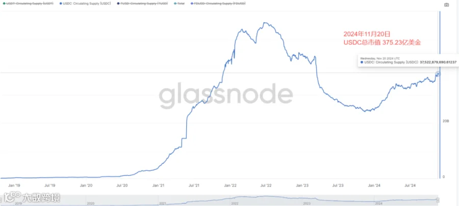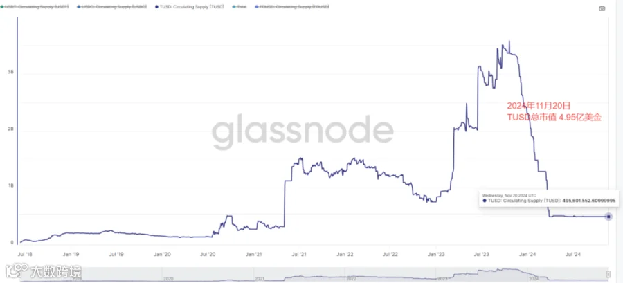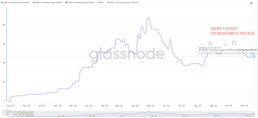 USDT市值上涨至1287.48亿美金市值,USDC总市值上涨到375.23亿美金左右,TUSD市值维持在4.95亿美金左右,FDUSD目前为23.75亿美金。