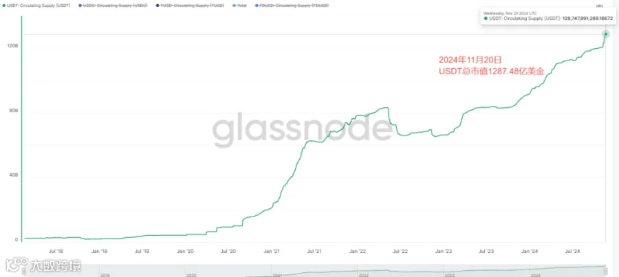四大稳定币总市值目前为1691.41亿美金,随着特朗普胜选,共和党拿下参众两院后,BTC市场价格不断突破新高,目前已接近10万美金,稳定币市值也一路走高,市场情绪依旧高涨。