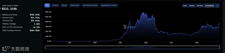 i. 从全链的TVL数据上来看,本周随着加密市场情绪复苏而上涨。TVL牛市最高1700亿美元,上上周数据946.87亿美元,本周数据1111.11亿美元,TVL上涨17.3%。