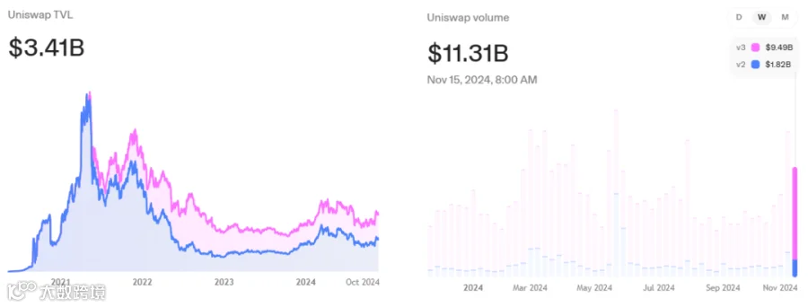 Uniswap TVL保持在34.1亿美金左右,整体交易量上升至113.1亿美金。随着BTC不断新高,Uniswap上交易量明显增加。