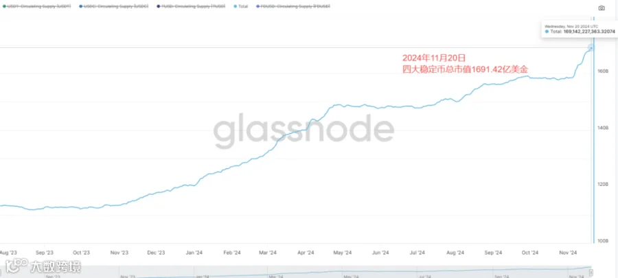 四大稳定币总市值目前为1691.41亿美金,随着特朗普胜选,共和党拿下参众两院后,BTC市场价格不断突破新高,已接近10万美金,稳定币市值也是一路走高,市场情绪依旧高涨。
