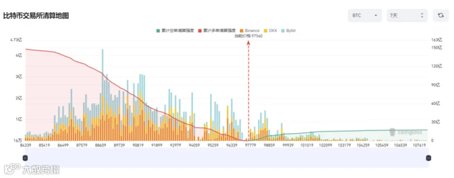 i. 从本周中心化交易所合约交易BTC清算地图来看,BTC本周清算强度多空比力量悬殊,多单累计清算强度147.97亿美元,空单方面累计清算强度17.47亿美元,空单在97779至102099为密集清算区,多单在96939至85419为密集清算区。