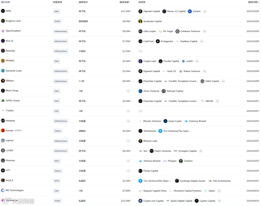 本时间段内一级市场融资项目和数量依旧比较多,主要以Defi和基础设施类项目居多。