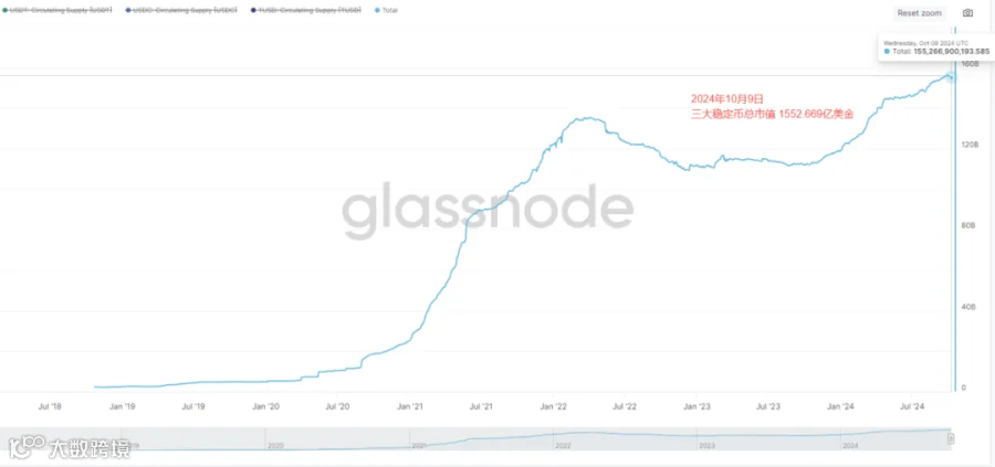 三大稳定币总市值目前为1552.669亿美金,相比之前的1548.08亿美元,总市值增加4.589亿美金左右。稳定币总市值本时间段内依旧增长,但是增长速率变慢。