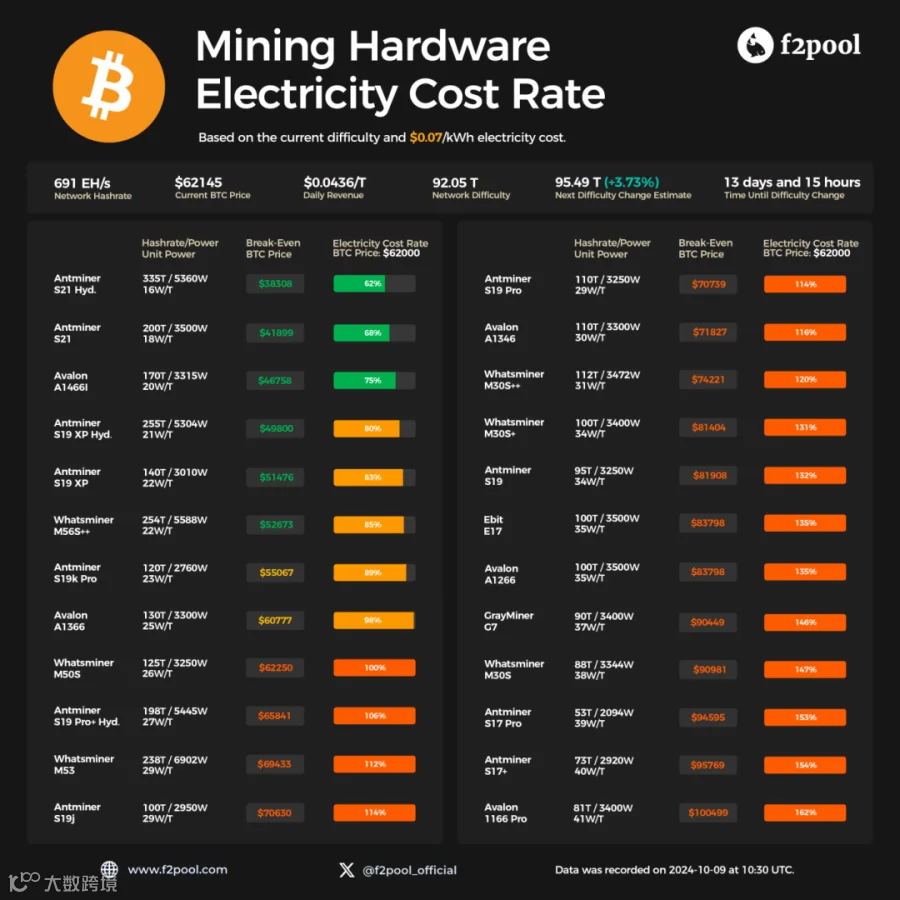 BTC挖矿难度10月9日增加 4.12%,达到 92.05 T。在BTC价格 62,000 美元、电价 0.07 美元/千瓦时的情况下,只有单位功率低于 26 W/T 的矿机才能够开机,但部分现存矿机均处于关机中。