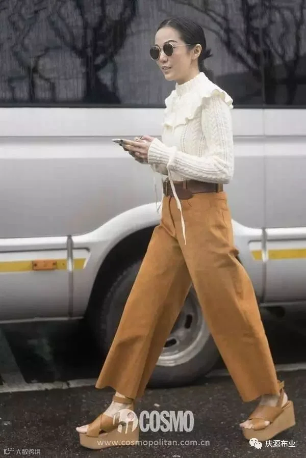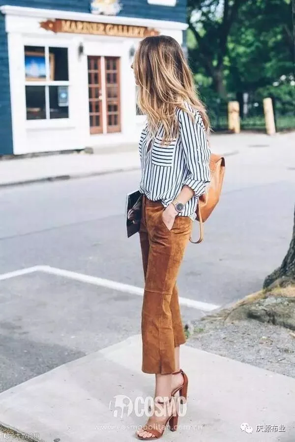 麂皮的裤子,驾驭系数有点难,不过选择一条九分长度的,利落又干练。
