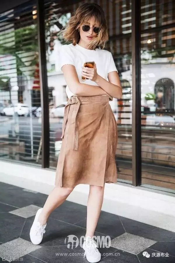 麂皮半裙,搭配一件白Tee,外套随便披上一件长大衣外套或者是厚的牛仔外套,美得得体又大方!