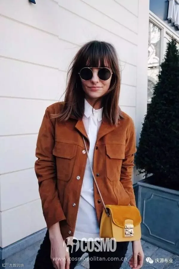 麂皮的夹克外套搭配一只有麂皮细节的小挎包,俏皮又带着自然的优雅感。
