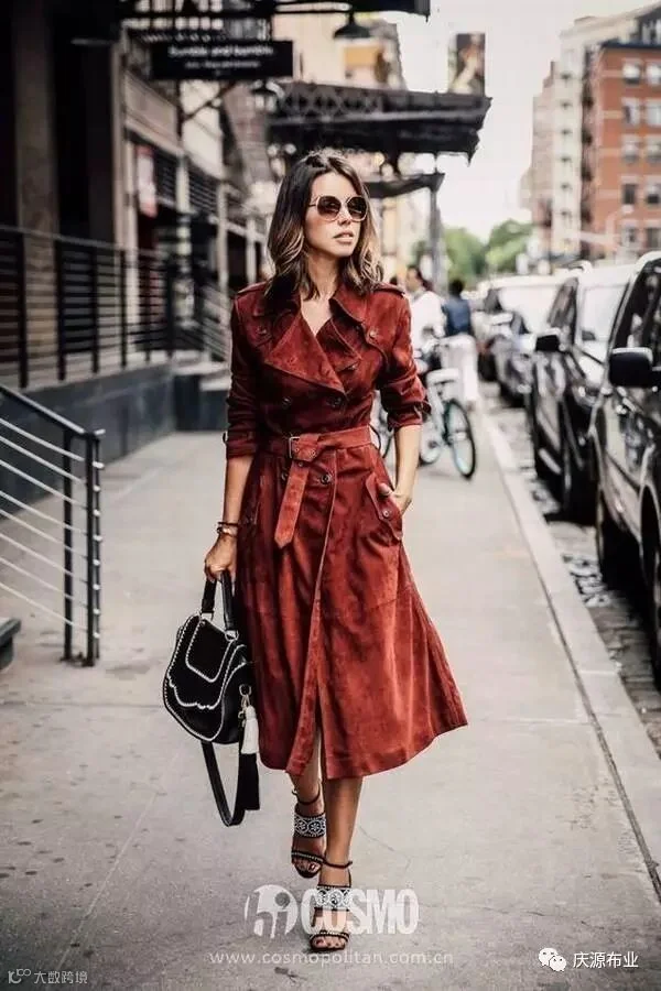 砖红色的麂皮长款风衣,不仅气场更强,而且其实麂皮质地的外套保暖效果更好哦。