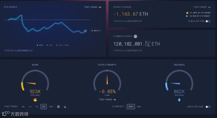 ii. ETH主网结束连续7周通缩后短暂一周呈现通胀,本周再次反转,继续通缩,7天年通胀率为-0.05%。