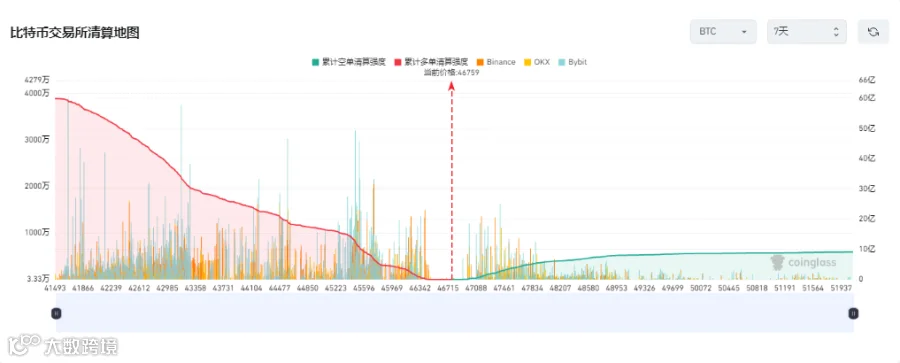 i.从本周中心化交易所合约交易BTC清算地图来看,BTC本周多单累计清算强度大于空单累计清算强度,空单累计清算强度8.09亿美元,多单方面累计清算强度59.81亿美元,多单在当前价位46759至46342为真空区,在46342至41493为密集清算区,空单在当前价位46759至47088为真空区,在47088至48953为密集清算区。