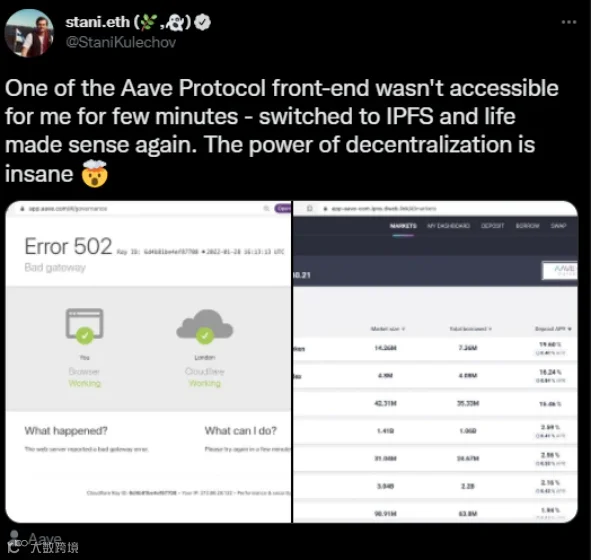 Aave dApp 前端于 2022 年 1 月 20 日下线,但仍可通过 IPFS 托管的网站副本访问。