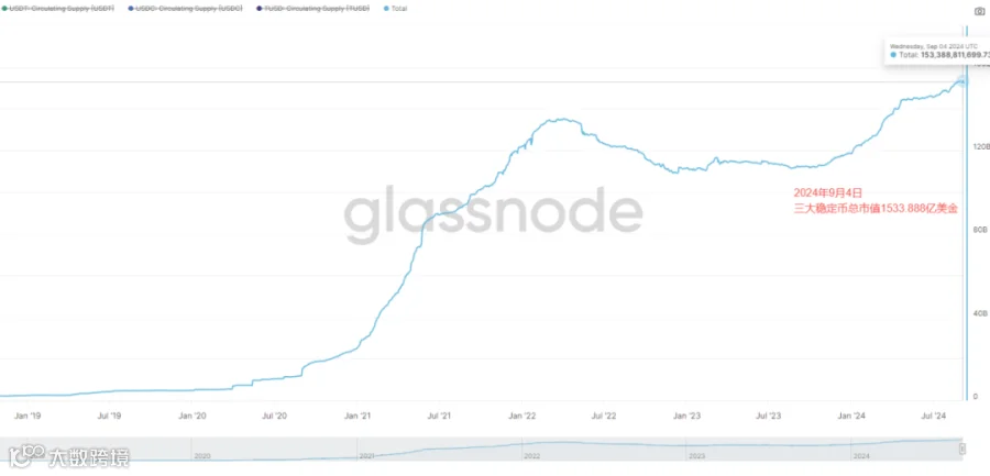 三大稳定币总市值目前为1533.888亿美金,相比之前的1526亿美元,总市值增加7.888亿美金左右。稳定币总市值本时间段内依旧增长。