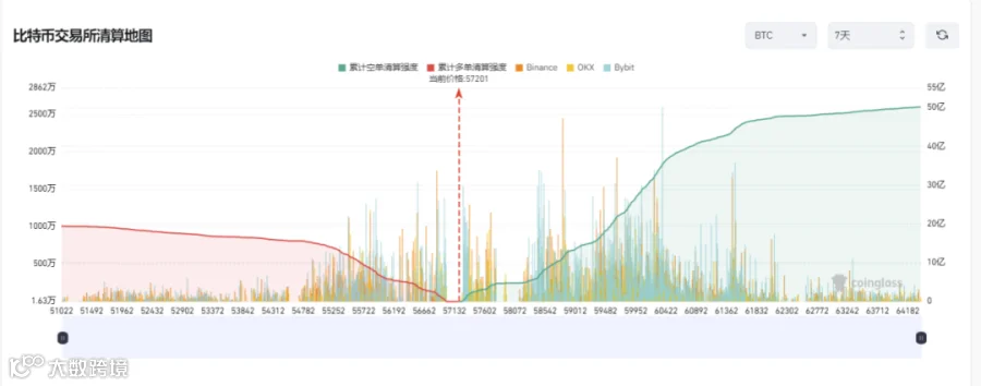 i. 从本周中心化交易所合约交易BTC清算地图来看,BTC本周清算强度空头力量略胜一筹,多单累计清算强度19.38亿美元,空单方面累计清算强度50.16亿美元,空单在57132至62302为密集清算区,多单在57132至54782为密集清算区。