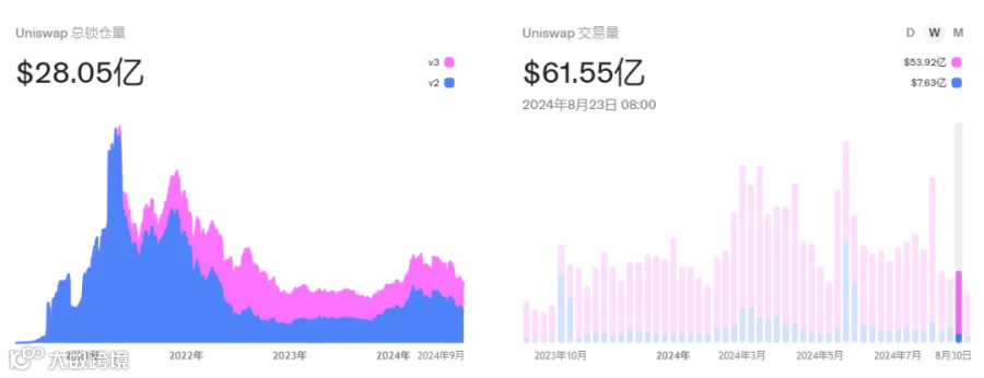 Uniswap TVL下降到28亿美金左右,整体交易量维持在61.66亿左右。
