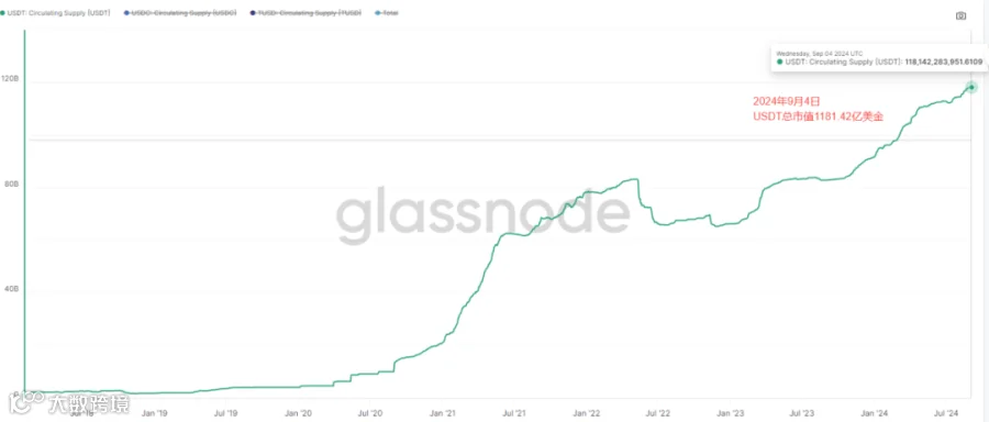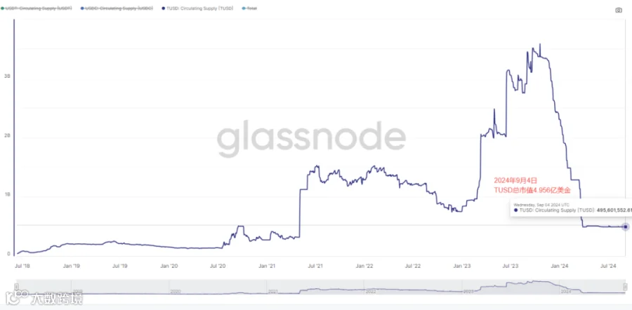 USDT市值继续保持增长状态,目前市值增加至1181.42亿美金市值,USDC总市值稍微下降至347.5亿美金,TUSD市值维持在4.95亿美金左右。