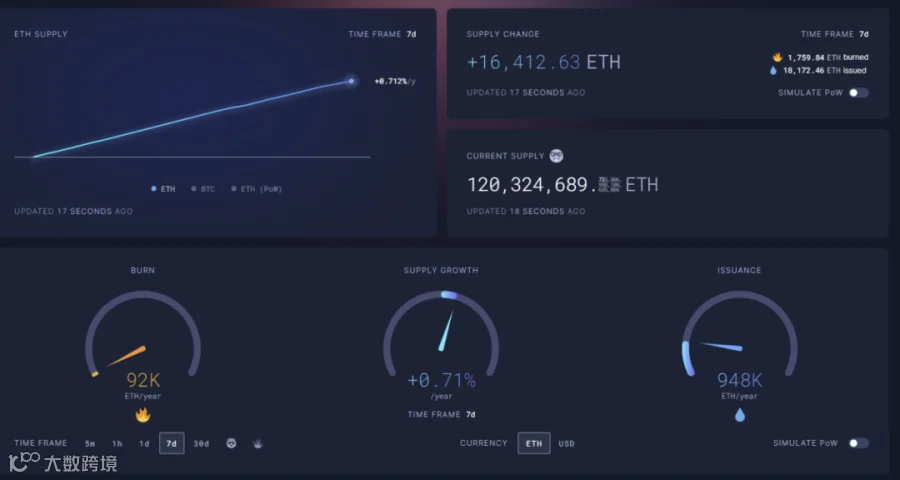 f. 以过去 30 日的数据估算,ETH 可能会在一年内增发 94.4 万枚,但只能销毁 15.1 万枚,综合计算后 ETH 已处于通胀状态,实施通胀率则为 0.66% 。