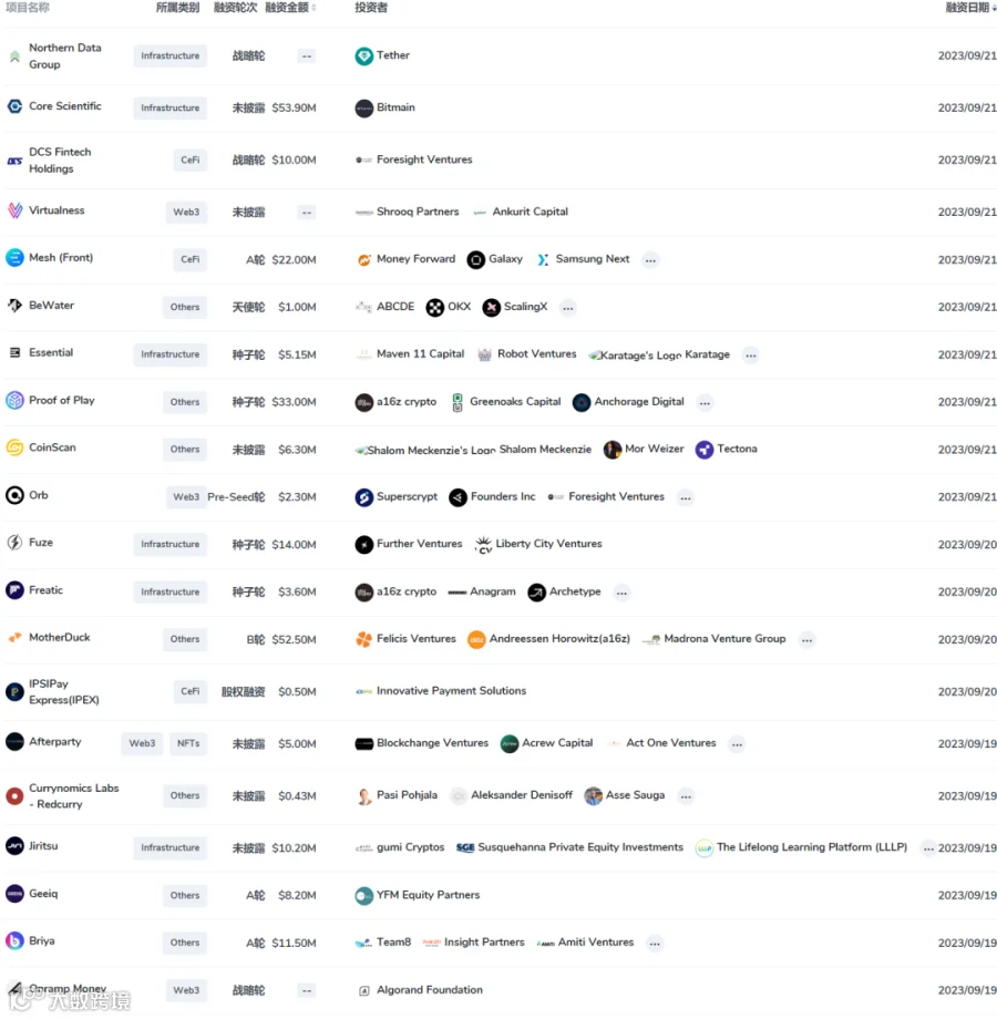 一级市场融资恢复了一定信心,融资金额和数量有所增加,尤其大型机构(A16Z)这几周都有投资相关项目,表明机构对后市持乐观态度。