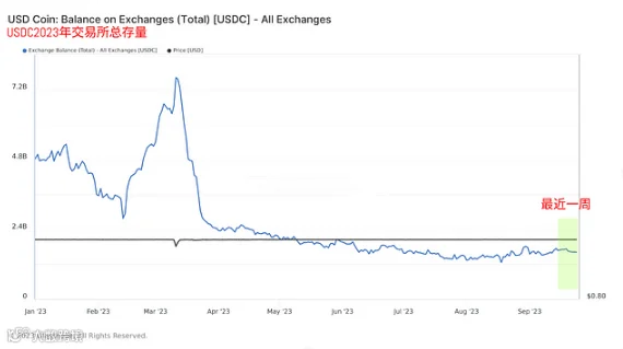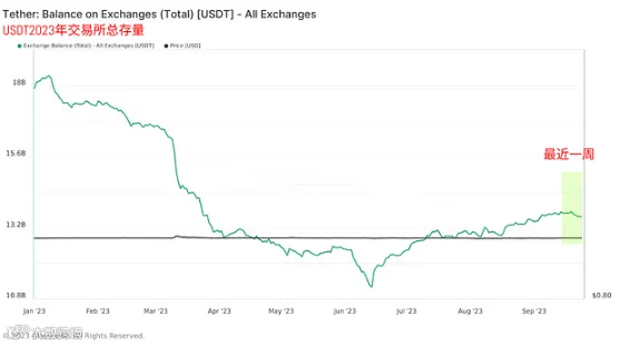 i. 从过去一周稳定币在交易所的数据看,USDT在所有交易所的总存量下降1.3亿美元,USDC在所有交易所的总存量也下降了9,000万美元,这两个主力稳定币存量的下降既有可能转换成了购买力,也有可能是直接离场。