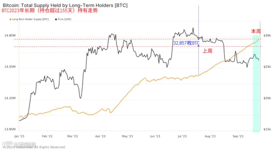 i. 从长期持有BTC的数据看,更多的BTC向着长期持有方向移动,截止目前已有14,824,462枚BTC155天未发生地址变化。