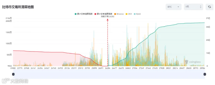 i. 从本周中心化交易所合约交易BTC清算地图看,BTC多空方呈现较大差异。由于本周价格下跌,多军疲软,仅在25890处有大额清算订单,约1580万美元,相对松散的挂单价格区间为26100至24980。