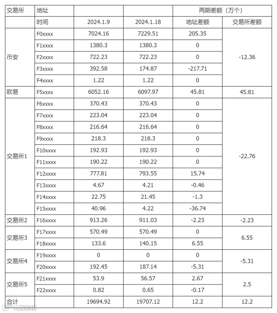 交易所地址:1 月 9 日到 1月 18 日共流进 12.2万个,流入趋于平缓。
